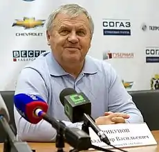 Vladimir Vasilievich Krikunov (Russian: Владимир Васильевич Крикунов, born March 24, 1950) is retired Soviet and Russian ice hockey player and former head coach of team Russia. He is currently a coach of the KHL club Dinamo Riga.[1] As a player Krikunov played for Dinamo Riga and Krylya Sovetov Moscow. During his coaching career he coached Dynamo Moscow and Team Russia. He won Russian championships as a coach in 2004/2005 season, bronze medal at world championships and lead Russian team in 2006 winter olympics.