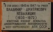 Vladimir Dmitrievich Nebylitsyn, Russian: Владимир Дмитриевич Небылицын (1930, Chelyabinsk region — 1 October 1972, near Adler) was a Russian psychologist, one of Boris Teplov's disciples, professor (1968), associate member of the Russian Academy of Pedagogy.