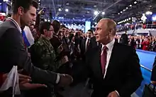 It was assumed that Putin would announce his nomination on 14 December 2017, during his annual press conference.[8] However, at the beginning of December 2017, some experts said that Putin would announce his participation in the elections on 6 December, during the Volunteer of Russia 2017 awards. Putin's press Secretary Dmitry Peskov, commenting on these reports said that Putin could announce the nomination any day.[9] On 6 December, after the presentation of awards, Putin declined to answer the question about participation in the elections, saying that in the near future he will decide on whether to participate in the election.[10] A few hours later, speaking to the workers of the GAZ automobile plant, Putin announced that he will again run for president.[11]