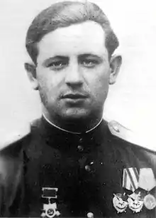 In April 1942 he was deployed to the warfront with the 159th Fighter Aviation Regiment, and on 30 August that year he gained his first aerial victory - the shared kill of a Bf 109. However, it was not until November that he gained his first solo shootdown - another Bf 109. He went on to gain another shootdown two days later, which turned out to be his last aerial victory on the Curtiss P-40 Warhawk. Eventually in May the next year he tallied his first kill on the new La-5, and from then on he quickly increased his tally, often gaining two shootdowns in a day; throughout the battle of Leningrad he engaged in intense aerial battles, especially in early 1944. In April 1944 he was nominated for the title Hero of the Soviet Union for completing 203 sorties, engaging in 53 dogfights, and tallying 20 solo plus six shared shootdowns. However, being awarded the title posthumously in August rapidly increased his tally during the intense battle for the Karelian Isthmus. Accounts of his last flight differ - some sources claims he shot down two enemy aircraft before fatally ramming another, but those claims are not reflected in his official tally, which indicates the shootdown of one Bf 109 on 26 June 1944 before he was killed in action.[2][3]