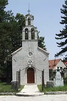 The church was initially made of "plot" (Serbian: плот), i.e. of sticks, switches and mud. It was rebuilt three times. First as "suvomeđa" (Serbian: сувомеђа), which means of stones without mortar; then of "klačena" (Serbian: клачена), which is stones with lime mortar; and finally, in 1864 the church received its current form.[11][12] A guard rail around the church was built in 1897 using barrels of Ottoman rifles[13] captured in 1858 during the Battle of Grahovac.[14]