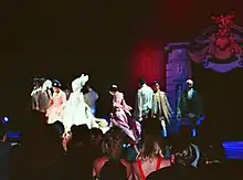 Writer Carol Clerk has suggested that Madonna bore "great resemblance to Marie Antoinette".[45] In a 2015 interview former Madonna dancers Luis Camacho and Jose Gutierez explained that the inspiration for theme in fact came from the 1988 film Dangerous Liaisons. Prior to the VMA performance, Madonna was uncertain whether she should perform "Vogue" or "Keep It Together", but just before the end of the concert tour, during a game of charades with her troupe, Madonna realized the connection between the "arrogant and aristocratic" attitudes and mannerisms of vogueing, and those of the characters in Dangerous Liaisons, so she arranged for the troupe to be dressed in appropriate 18th-century-styled costumes, and Madonna herself performed in one of the lavish gowns that Glenn Close had worn in the film.[64][65] Camacho also recalled that the troupe was very nervous about their performance, because part of the routine called for Madonna and her singers to throw their fans in the air and catch them, but they kept dropping them in rehearsals. However, on the night, the move went off flawlessly, and Camacho said that the dancers were so relieved that they spontaneously applauded them.[66] During the performance, Madonna and her dancers flashed their undergarments during their routine, at one point Madonna pushed the faces of two male dancers into her breasts, one of her dancers also fondled her breasts, and another briefly put his head under Madonna's skirts. Overall, the performance was ranked as the second best in the history of MTV Video Music Awards in a Billboard poll.[67]