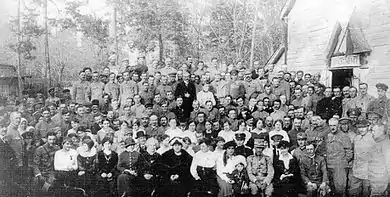 At the time, the two recruiting commissions in Vladivostok were also reactivated by the arrival of an international anti-Bolshevik force. Their propaganda leaflets, drafted by Bukovinian Iorgu G. Toma, reached all 40 POW camps in the region, urging any volunteer to make his own way to Chelyabinsk.[89] That city emerged as a main site of Romanian political and military activity, with a reported population of 3,000 liberated Romanians (July 1918).[53] Major Dâmbu put a momentary stop to Bolshevik influence by arresting Milovan and ordering the Samaran unit to Chelyabinsk.[85] A complex set of sanctions were imposed, in the hope of curbing dissent, ranks were reintroduced, uniforms on the Romanian Land Forces model were distributed around, and a patriotic cultural section began to function.[90]