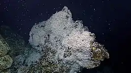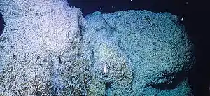 The biology at the Von Damm vent field are similar to those found at the Beebe site to the north, though slightly more diverse. In addition to shrimp, squat lobsters, and anemones, Von Damm features extensive coverage of limpets over rocky faces, eelpout fish at venting areas, and tube worms similar to those observed in the Pacific.[11][12] Tube worms have been detected in the vicinity of Shrimp Hole, which exhibits chemical characteristics more aligned to that of a methane seep.[10]