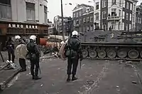 The rioters threw objects and petrol bombs, and police responded with tear gas. Street fights continued until 3 March. A tank that was deployed, driven by Major Tom van Erk, managed to demolish the barricades. Calm returned that day.[2]