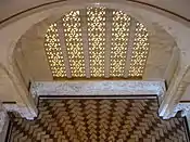 The main entrance of the building leads into the domed Hall of Heroes. This massive space, flanked by four huge arched windows made from yellow Belgian glass, contains the unique marble Historical Frieze which is an intrinsic part of the design of the monument. It is the biggest marble frieze in the world.[4] The frieze consists of 27 bas-relief panels depicting the history of the Great Trek, but incorporating references to every day life, work methods and religious beliefs of the Voortrekkers. The set of panels illustrates key historical scenes starting from the first voortrekkers of 1835, up to the signing of the Sand River Convention in 1852. In the centre of the floor of the Hall of Heroes is a large circular opening through which the Cenotaph in the Cenotaph Hall can be viewed.