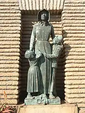 At the foot of the monument stands Anton van Wouw's bronze sculpture of a Voortrekker woman and her two children, paying homage to the strength and courage of the Voortrekker women.[2]: 15 On both sides of this sculpture black wildebeest are chiselled into the walls of the monument. The wildebeest symbolically depicts the dangers of Africa and their symbolic flight implies that the woman, carrier of Western civilisation, is triumphant.