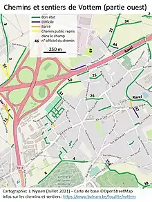Vottem holds 26 km of public footpaths, out of which 14 km are in good shape, 2 km are difficult (often included in croplands), 1 km illegally closed, 2 km inaccessible with unknown status and 5 km have been officially abandoned (often for sake of highway construction).[13][14]. This high density of footpaths is explained by the previous dominance of horticulture in this village. The intensive work in the gardens required a lot of foot mobility; and the products were transported to the local auction market by hand carts; the width of the footpaths was adjusted to these carts: minimum 1.17 metres.