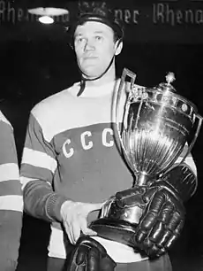 Bobrov began playing ice hockey for CSKA a year after his football start, in 1946. However, due to a knee injury sustained during the football season, he missed the first season.[4] His playing career in this sport lasted until 1957, with the years between 1950 and 1953 spent with VVS. Although football was Bobrov's first sport, his success in ice hockey was even greater. In 1950, a plane crash almost killed the entire VVS Moscow team. Bobrov survived the crash as he overslept and travelled by rail. In the Soviet Championship, which his teams won seven times, Vsevolod scored 254 goals in only 130 games; he is one of three players who averaged more than a goal per game in the Soviet Championship (along with Alexei Guryshev and Viktor Shuvalov; the three were linemates).[7] He played for the Soviet national team in the 1956 Winter Olympics, becoming one of the few athletes to participate in both the Summer and Winter Olympics. Bobrov proceeded to lead his country to the gold medal, and also won the World Championship in 1954 and 1956. Overall, he scored 89 goals in 59 games for his country. In Russian ice hockey, his name was given to an exclusive list of players, the Bobrov Club, who scored over 250 goals during their career.