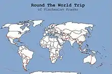 Beginning he flew from Moscow, he flew to Uzbekistan, then to the East, followed by going South to Australia, then to South America and North America; from North America he crossed the Atlantic Ocean to Africa, then he went across Africa and through the European countries he came back to Moscow.[3] In total Vyacheslav visited 6 continents, 36 countries and 145 towns and cities, overcoming 137 000 km. The budget of the travel was 33 thousand U.S. dollars.[9] The movements of the traveler were watched by a large number of people on-line at his website.[8]