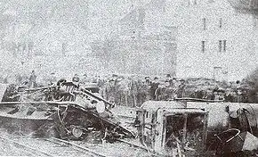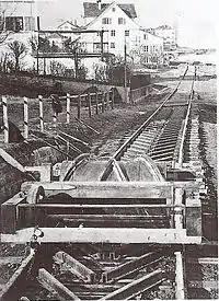 The trial of the Wetli system was held on 30 November 1876. The ascent with locomotive 253 was promising. After the train arrived in Schindellegi, the helical wheel which engaged on the track sections disengaged due to irregularities. The brakes failed during the descent to Wädenswil without intervention by the rollers. It is believed that oil leaked and fell the on the rails and the wheels, rendering the brakes ineffective. (This theory is set out by Alfred Moser, in his book[4] among others). The disaster was foreseeable, so that some of the people on board tried to escape by jumping off. All persons were injured, one member of the company's board was thrown out and killed. At the entrance to Wädenswil station, the train had a speed of an estimated 120 kilometers per hour. This caused the locomotive to overturn in the station and another person was killed. The casualties are not completely proven. Depending on the source, one dead and five injured or two dead and several injured are given. This could indicate that an injured person died later and thus was not counted as killed in the newspaper reports.
