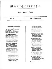Whether Eichendorff knew it or not, is not assured: «Wünschelruthe» (written in the way of those days—with an ‚h’) was the name of a literary magazine with the subtitle Ein Zeitblatt (A Time Sheet), published twice weekly from January to June 1818 in Göttingen in the times of High Romantics. Edited in the name of a student poet circle, named «Poetische Schusterinnung an der Leine»[7] by Heinrich Straube (1794-1847) and Johann Peter von Horn Thal (1794-1864), son of the mayor of Bamberg.[8] Other contributors were Achim von Arnim (1781-1831), Clemens Brentano (1778-1842), Brothers Grimm, Jacob (1785–1863) and Wilhelm Grimm (1786–1859), Ernst Moritz Arndt 1769–1860, and some professors and students of the local university. The magazine contained mainly literary texts, poems and stories, and announcements about the literary scene. Focussed on folk song and saga.[9] [10] It might well be that Eichendorff read it.