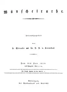 - Cf. Heinrich Straube/Johann Peter von Hornthal (Ed.): Wünschelruthe, ein Zeitblatt. Vandenhoeck-Ruprechtsche Buchhandlung, Göttingen 1818. Reprint: Kraus, Nendeln/Lichtenstein 1971. Digitalisat Bd. 1 Google Books