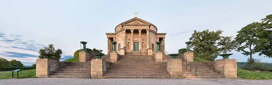 The Württemberg Mausoleum is a mausoleum located on the Württemberg, in the Rotenberg borough of Untertürkheim, in Stuttgart. It was designed by Giovanni Salucci for King William I of Württemberg to house the remains his second wife, Catherine Pavlovna of Russia. Construction elapsed over four years, from 1820 to 1824, while work on its decor lasted another four years. The remains of William I, Catherine, and their daughter Maria Friederike Charlotte, are housed in the mausoleum.
