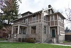The W.A. Simpson House in Boise, Idaho, is a 2-story Bungalow designed by Tourtellotte & Co. and constructed in 1909. Sandstone veneer covers first floor outer walls, and the second floor is veneered in stucco. The house shows a Tudor Revival influence with half-timber decorations above the sandstone. An attic dormer faces the 10th Street exposure, and the roof depends on a single, lateral ridgebeam. The house was added to the National Register of Historic Places in 1982.[2]