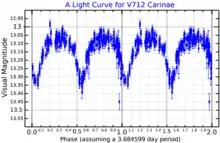 Every 3.6 days the two stars in this system revolve around each other. Although the stars are in a very tight orbit, both stars in the system are detached.[11] The two stars eclipse each other on each orbit, producing a drop in brightness of about 0.4 magnitudes. The brightness is also continuously variable outside the eclipses due to the distorted shapes of the two stars.[9] The primary and secondary minima are almost the same depth since the size and temperature of each star is almost identical.[2]
