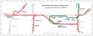The new stop was completed on October 30, 2011. Officially, the station has been in existence since 17 June 2011 and is located on the route from Grünauer Kreuz to Berlin Brandenburg Airport. The cost of this project amounted to about seven million euros (as of January 2014), which was financed by the municipality of Schönefeld itself.[5] After the opening of the new airport (BER) was initially delayed even further, 3 June 2012 was set as the opening date for the airport and the stop, which could not be met. The stop in Waßmannsdorf was opened when the airport started operating in 2020.