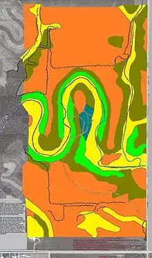 Wabasha County lies on Minnesota's border with Wisconsin (across the Mississippi River. The Mississippi flows southeast along the county's eastern line. The North Fork of the Whitewater River flows east through the southern part of the county, then discharges into the Whitewater in Olmsted County. The combined Whitewater then enters the southeastern part of Wabasha County, flowing northeast to its discharge point into the Mississippi. The Zumbro River flows east-northeast through the county to its discharge point into the Mississippi. East Indian Creek and Miller Creek drain the northern part of the county into the Mississippi. The county terrain consists of low rolling hills, considerably rutted by drainages, with all available area devoted to agriculture.[5] The terrain slopes to the east and south, with its highest point on its upper west border at 1,191' (363m) ASL.[6] The county has a total area of 550 square miles (1,400 km2), of which 523 square miles (1,350 km2) is land and 27 square miles (70 km2) (4.8%) is water.[7] Wabasha is one of 17 Minnesota counties with more savanna soils than either forest or prairie soils.