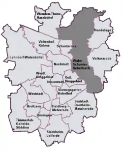 The district was formed in 2011 out of the former districts of Wabe-Schunter and Bienrode-Waggum-Bevenrode.[2][3] Both districts consisted of villages that were incorporated into Braunschweig during the 20th century, in 1934 (Gliesmarode, Querum, and Riddagshausen) and in 1974 (Bevenrode, Bienrode, and Waggum).