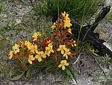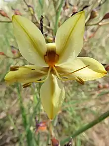 Wachendorfia paniculata is a species of plant of 10–90 cm (3.9–35.4 in) high, that emerges during the winter from an underground rootstock. It has entire, sword-shaped, mostly hairy, line- to lance-shaped, straight or sickle-shaped leaves, set in a fan at ground level with a lax to dense panicle consisting of pale apricot to yellow mirror-symmetric flowers with six tepals, three stamens and a undivided style that curves either to the right or left. The species is assigned to the bloodroot family. Flowering occurs between August and December at sea level, and until early February at high altitude, with a distinct peak from September to November. It can only be found in the Cape provinces of South Africa.[1] Like other species of Wachendorfia, it is called butterfly lily in English and rooikanol or spinnekopblom in Afrikaans, and this species in particular is also called koffiepit in Afrikaans.[2][3]