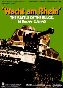 In December 1944, in an operation codenamed "Wacht am Rhein" ("Watch on the Rhine"), the German army tried to break through the lightly guarded Ardennes Forest sector in an attempt to drive a wedge through the Allied armies, take the port of Antwerp and force a separate negotiated peace with the British, French and American allies.[1] Wacht am Rhein is a simulation of that conflict, a grand tactical two-player wargame set at the battalion and company level. With 1400 counters, it is considered a "monster" wargame.[1]