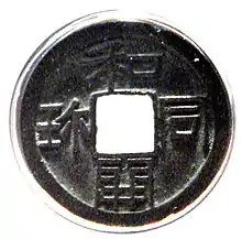 Wadōkaichin (和同開珎), also romanized as Wadō-kaichin or called Wadō-kaihō, is the oldest official Japanese coinage, first mentioned for 29 August 708[1] on order of Empress Genmei.[2][3][4] It was long considered to be the first type of coin produced in Japan. Analyses of several findings of Fuhon-sen (富夲銭) in Asuka[5] have shown that those coins were manufactured from 683.