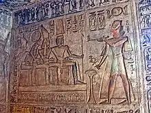 The second larger temple which was built at el-Sebua was known as "The Temple of Ri'amesse-meryamun [Ramesses II] in the Domain of Amun" and constructed roughly 150 m northeast of Amenhotep III's temple.[5] Contemporary monuments and representations of the viceroy of Kush, Setau, indicate that this temple was set up between Years 35 and Year 50 of Ramesses II.[5] Setau is known to have served as the Viceroy of Kush or Nubia between Year 38 to 63 of this pharaoh's reign and was responsible for Ramesses' later Nubian temples.[6] The temple of Wadi es-Sebua was the third sanctuary or chapel constructed from rock with a forecourt built with stones that Ramesses II erected in Nubia. Located at approximately a hundred and fifty kilometers south of Aswan, on the western bank of the Nile, the temple owed its importance to the fact that during the Ramesside period, the city was built at the outlet of the caravan roads, was used as the place of residence for the viceroy of Kush and because it was located at a difficult stretch of the Nile which was difficult for boats to traverse up against the current. Ramesses II entrusted the management of his work projects here to the viceroy of Nubia Setau which, if one judges by the poor quality of the Osiride style and statues of the court, was forced to settle on an "untrained work force, many of whom were snatched from the Libyan oases" and by "inferior raw materials."[7]