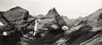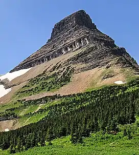 Like the mountains in Glacier National Park, it is composed of sedimentary rock laid down during the Precambrian to Jurassic periods. Formed in shallow seas, this sedimentary rock was initially uplifted beginning 170 million years ago when the Lewis Overthrust fault pushed an enormous slab of precambrian rocks 3 mi (4.8 km) thick, 50 miles (80 km) wide and 160 miles (260 km) long over younger rock of the cretaceous period.[5]