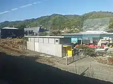 A goods shed was built in 1895 and rebuilt in 1979. The platform was extended in 1897 and the station was improved in 1909, so that by 1911 it had a shelter shed, platform, cart approach, 25 ft (7.6 m) by 12 ft (3.7 m) goods shed, loading bank, cattle and sheep yards and a passing loop for 59 wagons (extended in 1940 to 90 wagons). From 1908 a tablet was used. A ladies waiting room was added in 1929, detached from the station building, for £214.14.6.[8] Electric lights replaced oil at about the same time.[9] Railway houses were built in 1892, 1928, 1930 and two in 1940. A new 24 ft (7.3 m) by 12 ft (3.7 m) station building, with an office, signal control panel, and accommodation for parcels was built by NZR staff, slightly to the south of the existing building, in 1968. The stockyards were removed in 1965.[8] The station closed to goods traffic on 3 May 1986.[10]