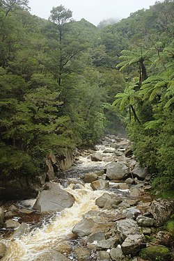 Almost all of Wainui River's course is through dense native bush, with the lower half meandering through a narrow gorge where the river eventually flows over the 20 metres (66 ft) tall Wainui Falls, one of the most accessible waterfalls in the Tasman region. Wainui Falls can be reached from a car park in Wainui Bay via the gentle Wainui Falls Track.[2]