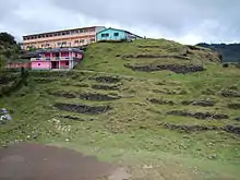 The main axis of the site has an orientation of S 52° E, aligned along the spur occupied by the ruins.[11] The site is distributed over three different levels, consisting of the ground level of the ridge, an area of elevated terrain to the northeast, and a depression to the southwest. The elevation and the depression were both natural features that were incorporated into the pre-Columbian town. Several range structures are situated upon the northeastern portion of the ridge, and upon the elevation, with a view across the valley to nearby salt springs. The slope occupying the southwestern portion of the site was modified with the construction of five stepped platforms, in a similar manner to that of Mesoamerican pyramids. The lower portion of the site supports a large structure that was probably a pyramid.[1]