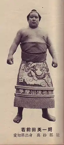 Wakamaeda Eiichirō (born Hideo Yui; 24 November 1930 – 3 June 2007) was a sumo wrestler from Nishibiwajima, Aichi, Japan. Making his professional debut in January 1950, he reached the top makuuchi division in May 1954. His highest rank was sekiwake. He won four special prizes and three gold stars for defeating yokozuna. He retired in January 1964 and became an elder of the Japan Sumo Association under the name of Onoe.