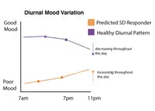 Mood fluctuations are currently thought to be dependent on circadian processes. A typical healthy individual without a mood disorder shows circadian-locked fluctuations in mood, with positive mood beginning right after the morning awakening, and decaying as the day goes on during prolonged wakefulness. A typical individual with depression will show the opposite mood fluctuation cycle, with a low mood right after morning awakening, which gradually becomes more positive with prolonged wakefulness. These circadian-locked changes across the day are referred to as "diurnal" variations in mood. Evidence across many sleep deprivation studies suggests that an individual's diurnal mood fluctuations can be used to predict whether they will respond to sleep deprivation therapy.[27] Individuals with depression who show the typical low morning mood that increases throughout the day are more likely to respond positively to sleep deprivation than individuals who show mood fluctuations that deviate from the typical pattern.[27] One caveat to these findings is that a single individual may show diurnal fluctuations that vary day-to-day, showing typical diurnal changes on one day while not showing any changes (constant mood) on the next. This complexity was addressed in studies that followed single individuals and administered repeated sleep deprivation on days when the individual showed different mood fluctuations. The studies showed that an individual's ability to show the typical mood fluctuations was a better predictor of whether they would respond to sleep deprivation treatment than the individual's mood state on the particular day that they underwent sleep deprivation.[27]