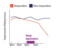 Responsiveness to sleep deprivation is also currently believed to be dependent on observable pattern in a person's regular sleep cycle, such as how quickly a person enters into a sleep cycle called rapid eye movement (REM) sleep.[28] Individuals with depression typically show abnormally short REM sleep onsets, meaning they enter into the REM sleep stage earlier in the course of the night than matched healthy controls. Individuals with depression who have short-latency REM sleep typically respond to sleep deprivation therapy more often than individuals with depression who do not show the typical short latency REM sleep pattern.[28]