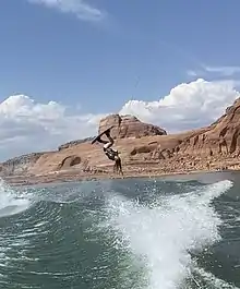 More advanced tricks call for what is known as inversion or “inverts”. An invert is considered any action where the board is above the head of the rider. This does not necessarily mean the rider is fully upside down, as evidenced by the Raley, a trick where the rider extends their body parallel to the water bending at the knees to achieve inversion.[21] The heel side backflip, otherwise known as a tantrum, is often regarded as the first and easiest invert to learn as an intermediate level rider. This is because the shape of the wake or the “kicker” (a type of floating ramp, used primarily at cable parks, that mimics the shape of a wake) naturally initiates the sequence of motions that are necessary to complete the trick.[22]