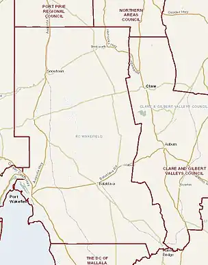 The Wakefield Regional Council includes the towns and localities of Avon, Balaklava, Barunga Gap, Beaufort, Blyth, Bowillia, Bowmans, Brinkworth, Bumbunga, Burnsfield, Condowie, Dalkey, Erith, Everard Central, Goyder, Hart, Hope Gap, Hoskin Corner, Inkerman, Kallora, Kybunga, Lake View, Lochiel, Marola, Mount Templeton, Nantawarra, Owen, Pinery, Port Wakefield, Proof Range, Rochester, Saints, Snowtown, Stockyard Creek, Stow, Watchman and Whitwarta, and parts of Alma, Barabba, Bute, Grace Plains, Halbury, Hamley Bridge, Hoyleton, Long Plains, Mundoora, Salter Springs, South Hummocks, Wild Horse Plains, and Wokurna.[7]