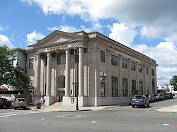 The Wakefield Trust Company was founded in 1854 as the South Reading Bank (Wakefield then being called South Reading). After several reorganizations and mergers, it acquired that name in 1926. This building was constructed in 1924, when it was known as the Wakefield National Bank. It was built at a cost of $300,000 to a design by Hutchins & French of Boston.[3] Its Classical Revival features followed those of the library, which stands one block north and was built in 1922, and precede those of the post office, which stands beyond the library and was built in 1936.[2]