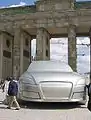 It is 10.2 m (33 feet) long, 4.5 m (15 feet) wide and 3.25 m (10.7 feet) high, weighing more than 10 metric tons (22,000 lb). Using 1,000 m2 (11,000 square feet) of glass fiber reinforced plastic lining and 120 m3 (32,000 US gallons; 26,000 imperial gallons) of Neopor foam, the sculpture Das Automobil comprises 16 steel segments on a steel frame. The sculpture was designed by the German car manufacturer Audi. More than 100 people were involved in the making. The public interest was high when the sculpture was unveiled on the western side of the Brandenburg Gate on April 6, 2006. Besides the mayor Klaus Wowereit, 600 guests, 100 photographers, TV crews and journalists took part in the celebrations.