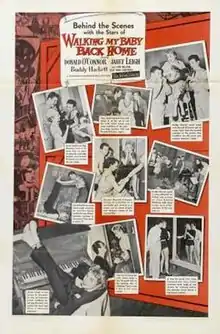 Walking My Baby Back Home is a 1953 American musical comedy film directed by Lloyd Bacon and starring Donald O'Connor, Janet Leigh, and Buddy Hackett.[1] It was Hackett's film debut.[2]