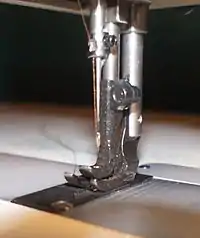 A walking foot is a mechanism for feeding the workpiece through a sewing machine as it is being stitched. It is most useful for sewing heavy materials where needle feed is mechanically inadequate, for spongy or cushioned materials where lifting the foot out of contact with the material helps in the feeding action, and for sewing many layers together where a drop feed will cause the lower layers to shift out of position with the upper layers. A walking foot is also good for sewing materials with varying layers because it can climb up and down these layers easier than other feeding mechanisms.[1]
