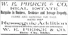 Soon after Idaho Territory became a state in 1890, the Pierces moved in September from Richfield, Kansas, to Boise City.[5] By October of that year, along with partners John M. Haines and L. H. Cox, he had founded W. E. Pierce & Co., a real estate and abstract company originally located at 820 Main Street, across from the Lemp Block.[6][7] W. E. Pierce & Co. were exclusive agents for the Resseguie Addition, the Hyde Park Addition,[8] the Lemp Addition,[9] Lemp's East Side Addition,[8] the DeLamar Addition,[10] the Bryon Addition,[11] and others.[2][12] The company also planted trees in areas under development.[13]