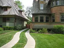 The house was designed by Frank Lloyd Wright in 1893 for Walter H. Gale, who was a member of one of Oak Park's "founding families" and a local hardware store operator. The house was the first design undertaken after he left Louis Sullivan's firm, Adler & Sullivan.[3][4] The house followed on in the nature of Wright's own home and was one of a series of modest homes designed in 1892 and 1893. Two of these homes were designed for Walter Gale on a speculative basis, the other being known as the Robert P. Parker House, which stand down Chicago Avenue from the Gale House.[5] The Gale House, like all of the homes designed in this "series," has symmetrical sides but they are difficult to see clearly because other buildings are built too closely.[5] The Gale House appears small but is quite roomy and it follows nearly identical plans to that of the other homes designed and built around 1893, though there are differences, most prominently in the roof profiles.[5]