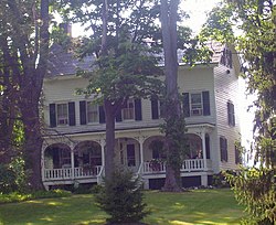 It is a five-bay two-and-a-half-story clapboard-sided structure with Gothic detailing and a molded cornice and plain frieze at the roofline. The wooden-shingled roof, pierced by brick chimneys at either end, is cross-gabled by a two-story rear wing projecting from the south side, itself with a one-story pent-roofed bay on its own west.[1]