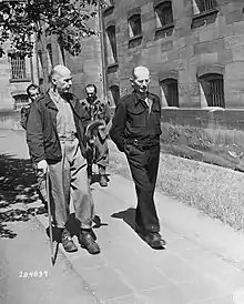 ![]() Wilhelm List and Kuntze (right) walking in a prison courtyard during the Hostages Trial | |