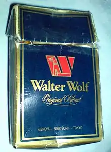 The cigarettes carry the name of the Austrian entrepreneur Walter Wolf.[3] The distinctive logo was also used in the Formula 1 racing team Walter Wolf Racing, as well as for perfumes.[4]