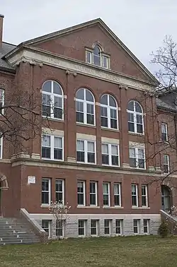 The old Waltham High School (located at 55 School Street) was constructed in 1902. Designed by Samuel Patch and Robert Glancey, it follows the local contemporary style of Romanesque and Classical Revival architecture. Expanded in the 1920s, the building eventually fell out of favor and was replaced with the current Waltham High School at a different location in 1969. It was used as the Central Junior High School in the 1970s and 1980s. The old Waltham High became defunct by the 1990s and sat empty for many years. The building was ultimately reoccupied; the additions constructed in the 1920s were removed, restoring the school to its 1902 appearance, and a modern addition was added directly behind the old building, which left the historical structure as the façade. The new construct, known now as John W. McDevitt Middle School (named for a former superintendent), entered service in 2003.[2]