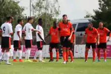 The current home kit is an orange shirt with black shoulders and a white trim, black shorts and orange socks. The current away kit is a blue shirt with white trim, blue shorts and blue socks in homage the original kit.[16]