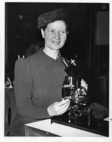 ![]() Wanda sitting at microscope at Columbia University lab | |