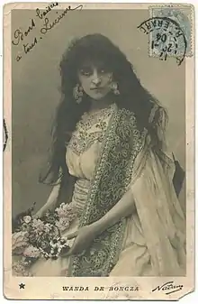 Wanda de Boncza was considered a stage beauty in Paris,[4] acting first at the Odéon, and then at the Comédie-Française. One English-language critic in 1901 described her stage presence as "little and dark, Parisian and perverse, she whose eyes are enigmas ... beautiful in her own odd way."[5] Her stage appearances included roles in Fiancée (1894),[6] La Barynia (1894),[1] On ne badine pas avec l'amour (1896),[7] Struensée (1898), La Conscience de l'enfant (1899), Alkestis (1900), and Le Marquis de Priola (1902).[8]