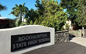 Rockhampton State High School is a government secondary (7-12) school for boys and girls at Campbell Street (23.3695°S 150.4992°E).[7][11] In 2018, the school had an enrolment of 1098 students with 93 teachers (89 full-time equivalent) and 51 non-teaching staff (38 full-time equivalent).[9] It includes a special education program.[7][12]